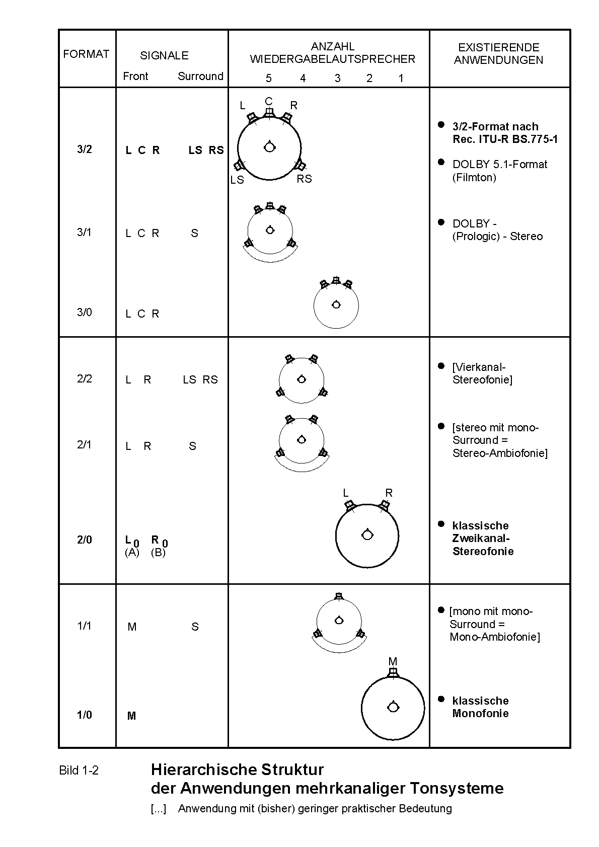 Im Rahmen der internationalen Standardisierung sind die gebräuchlichen Tonformate und deren Wiedergabeanordnungen in ein einheitliches hierarchisches System zusammengefasst, das Voraussetzungen für ihre Abwärtskompatibilität und damit für eine flexible Anwendung schafft, siehe [Bild 1.2].